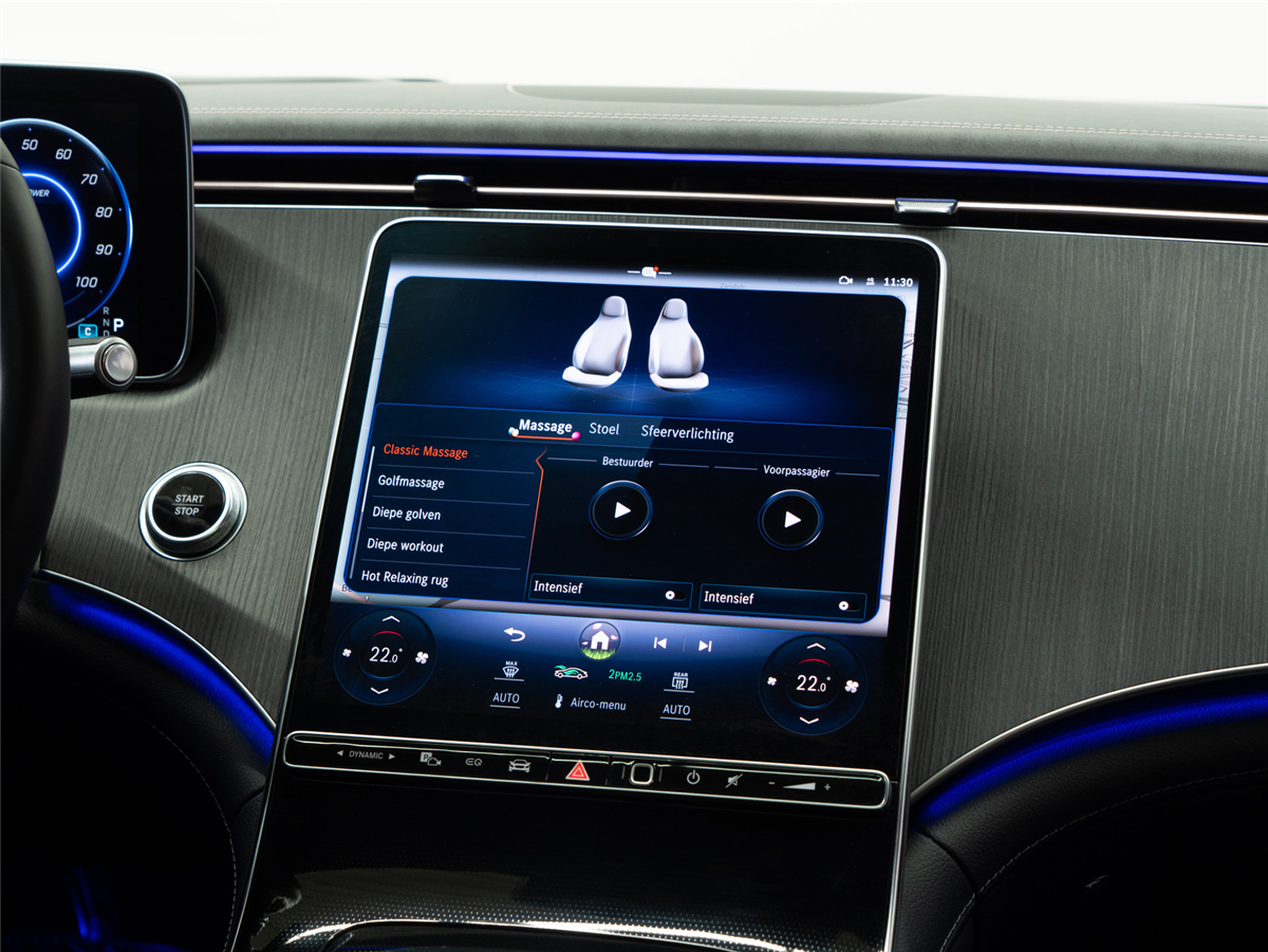 • PAI MBUX High-end displaypakket: 12,8" centraal OLED display (868), 12,3" bestuurderdisplay LCD (464), vingerafdrukscanner in de bedieningsbalk onder het centrale display (321), MBUX multimediasysteem (534);
