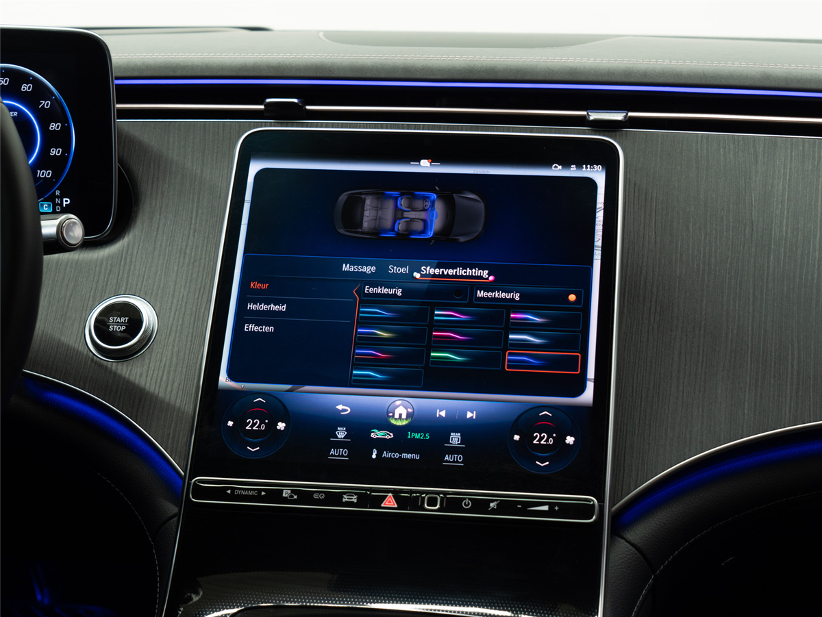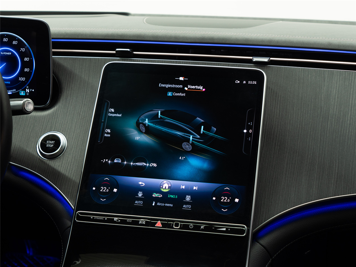 • PAI MBUX High-end displaypakket: 12,8" centraal OLED display (868), 12,3" bestuurderdisplay LCD (464), vingerafdrukscanner in de bedieningsbalk onder het centrale display (321), MBUX multimediasysteem (534);