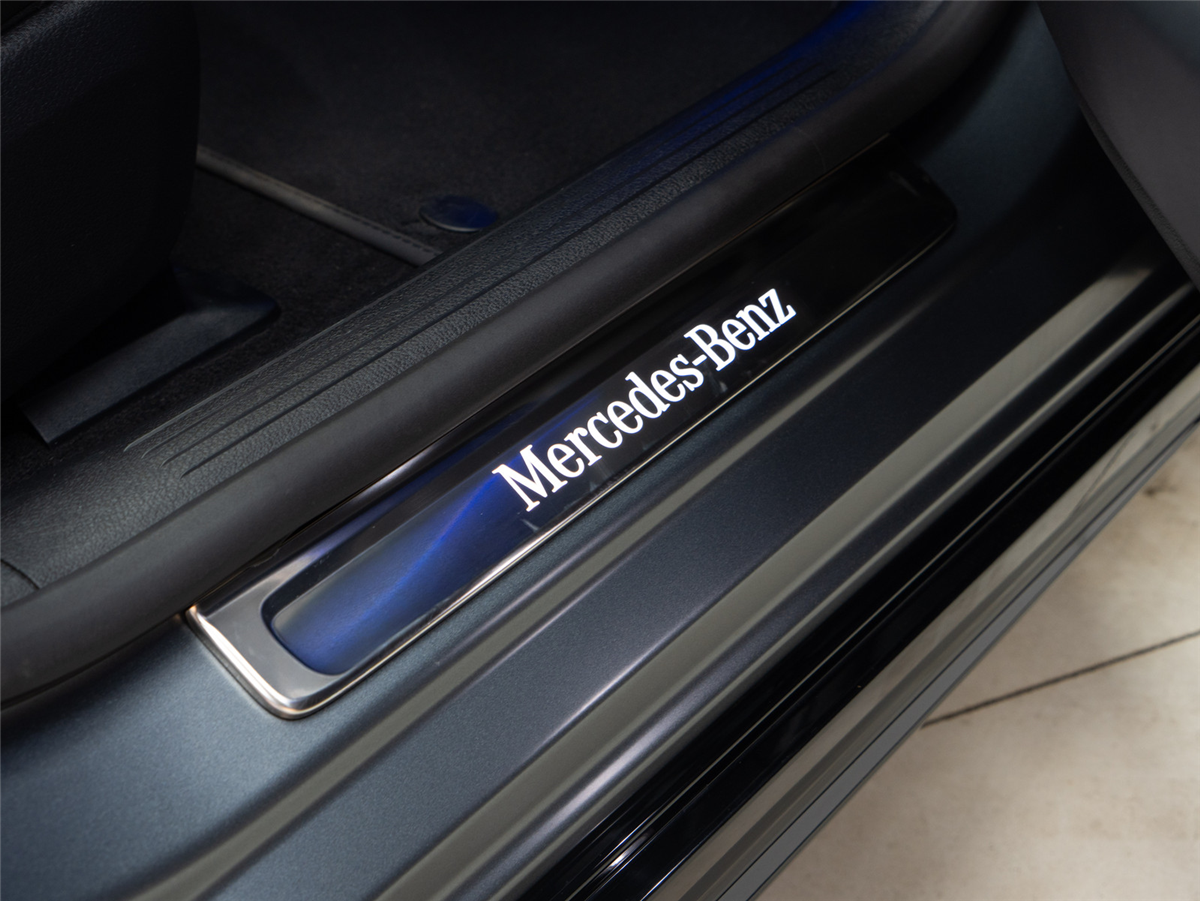 • U25 Verlichte instaplijsten met opschrift 'Mercedes-Benz'.
