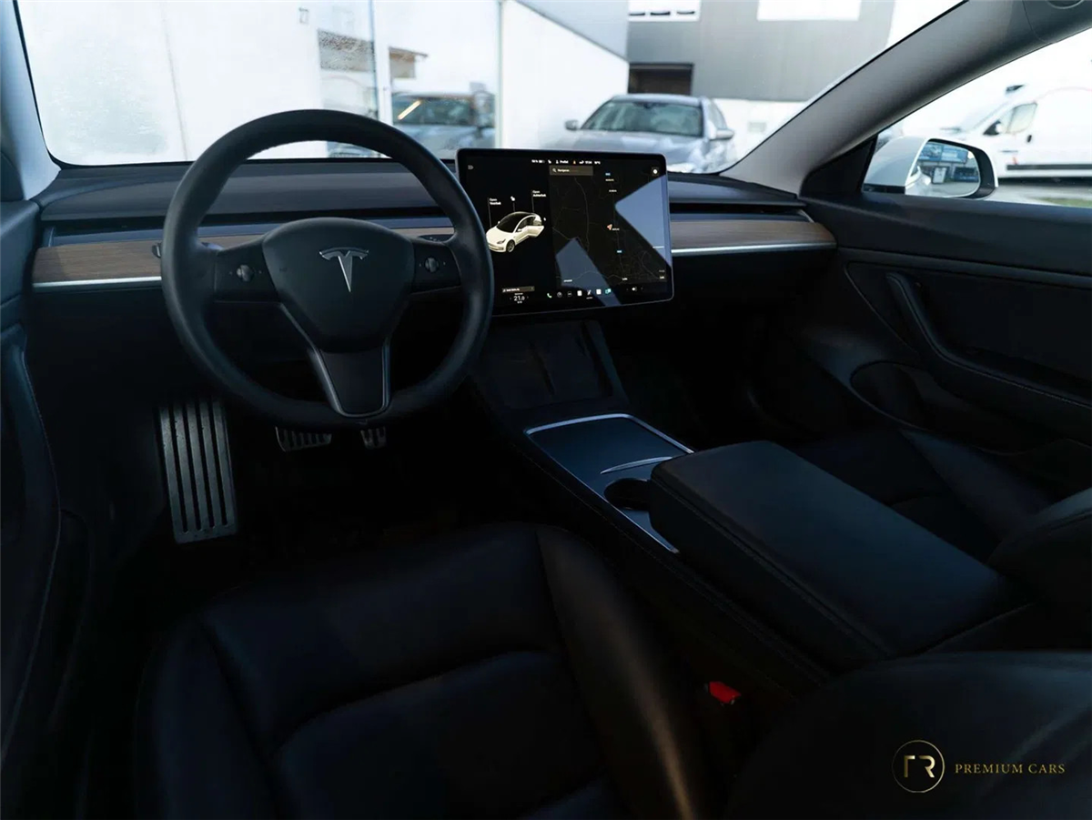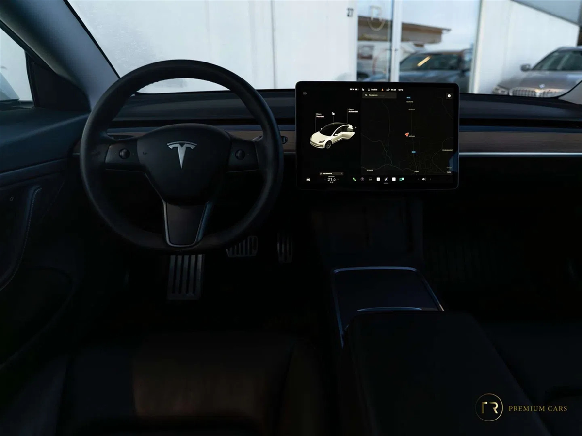 - Zwart interieur met minimalistische Tesla-afwerking